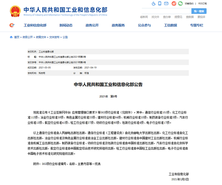 中華人民共和國工業(yè)和信息化部公告及563項(xiàng)行業(yè)標(biāo)準(zhǔn)編號(hào)、名稱、主要內(nèi)容等一覽表(文章來源網(wǎng)址:https://www.miit.gov.cn/zwgk/zcwj/wjfb/gg/art/2021/art_3ad89e3a12934c59945f6544361c3565.html)