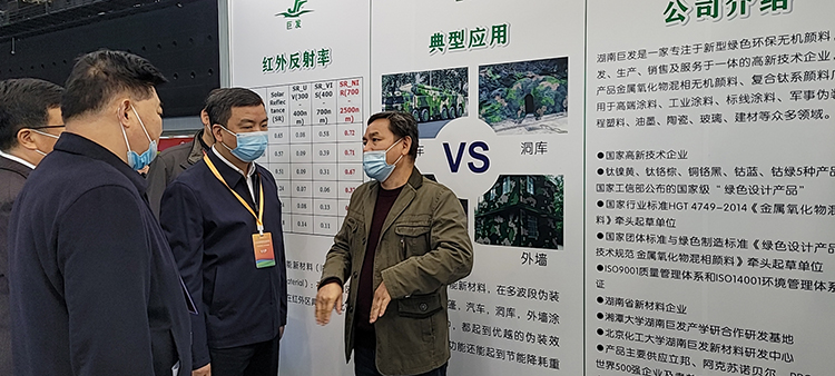 展會期間,湘潭市吳志雄副市長、貿(mào)促、工信、發(fā)改等各政府部門領導一行蒞臨湖南巨發(fā)展廳(A449)參觀指導。我公司總工程師王文強先生等工作人員熱情接待副市長一行。王文強總工程師向吳市長一行介紹了湖南巨發(fā)近年來,不斷斥巨資對5G通訊新材料及新型環(huán)保無機顏料等進行探討與摸索,陸續(xù)研制出5G通訊用LDS新材料、紅外反射無機新材料,環(huán)?;煜酂o機顏料等系列品種,現(xiàn)已逐步推向市場。吳市長一行領導對湖南巨發(fā)對公司不斷發(fā)展壯大的行業(yè)規(guī)模和日益廣闊的發(fā)展前景給予了充分肯定,并對今后企業(yè)的發(fā)展、競爭方向提出了建議。吳市長希望公司在下階段工作中,不斷鞏固現(xiàn)有技術優(yōu)勢的基礎,進一步加大科研投入力度,不斷拓寬、創(chuàng)新銷售思路,堅持高起點、高標準、高要求的管理模式,準確把握產(chǎn)品質(zhì)量關,不斷提高環(huán)保新材料系列產(chǎn)品在國內(nèi)外的知名度和美譽度。