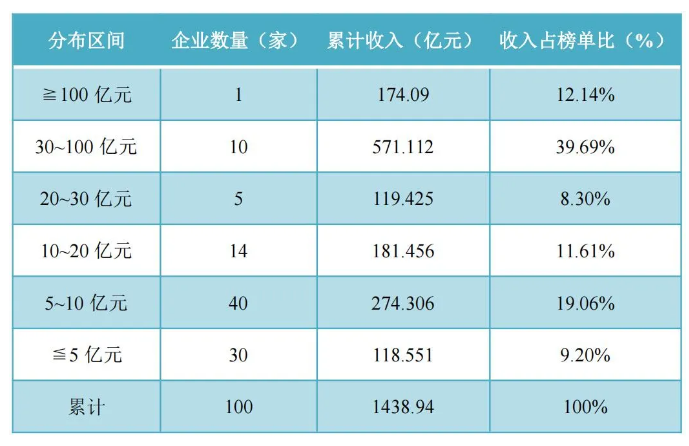 從企業(yè)規(guī)模分布來看,今年上榜企業(yè)在規(guī)模和數(shù)量上依然分布不平衡,企業(yè)間差距較大。銷售收入超過100億元的企業(yè)數(shù)量僅1家,較往年未變;在30-100億元之間有10家,較往年新增1家;在20-30億元之間的為5家,在10-20億元之間的有14家,在5-10億元之間的有40家,5億元以下的為30家。(如下表)